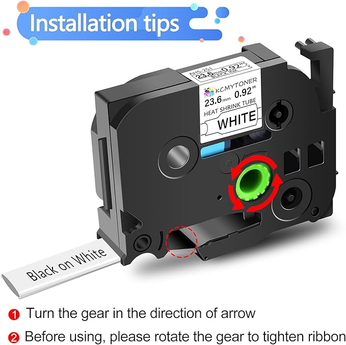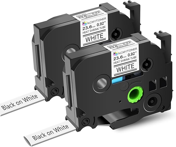 - Package Included: 2 pack KCMYTONER compatible for ptouch HSe-251 HS-251 HSe251 HS251 heat shrink tube label tapes; color: black text on white tape; size: 1 inch (23.6mm, flattened width) x 4.92 feet (1.5m).The size indication for this heat-shrink tube label is the width of the flattened tube as a label in a label printer. Do be aware that the size given relates to the label making machine, not the wire. HSe-251 23.6mm tube suits cables ranging from Ξ¦7.3mm to Ξ¦14.3mm in diameter.