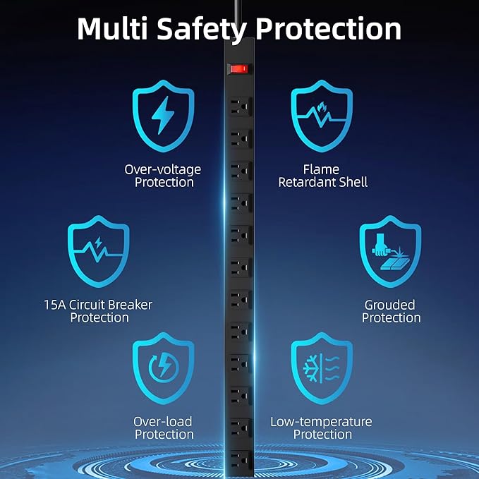 - OVERLOAD PROTECTION:A power switch with lighting has a built-in high quality 15A circuit breaker for overload protection. When the operating current exceeds the rated current, this power strip automatically cuts off the power supply from spikes, fires or other unsafe conditions.
