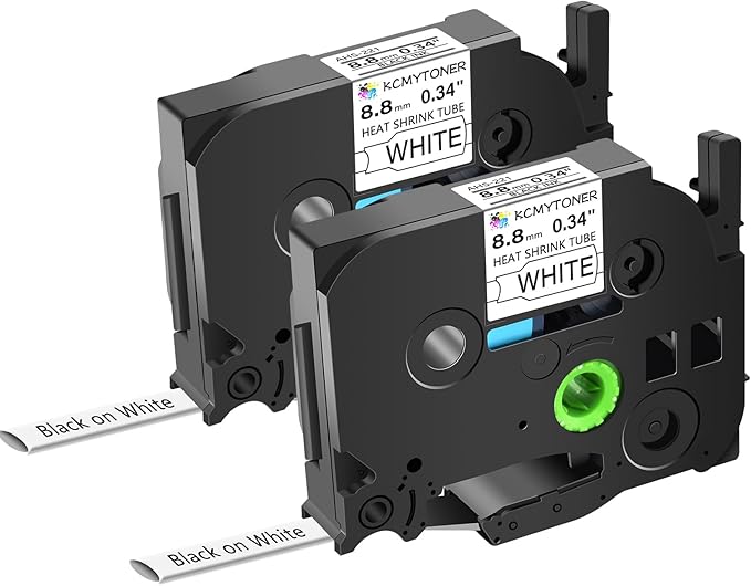 - Package Included: 2 pack KCMYTONER compatible for ptouch HSe-221 HS-221 HSe221 HS221 heat shrink tube label tapes; color: black text on white tape; size: 3/8 inch (8.8mm, flattened width) x 4.92 feet (1.5m).The size indication for this heat-shrink tube label is the width of the flattened tube as a label in a label printer. Do be aware that the size given relates to the label making machine, not the wire. HSe-221 8.8mm tube suits cables ranging from Ξ¦2.6mm to Ξ¦5.1mm in diameter.