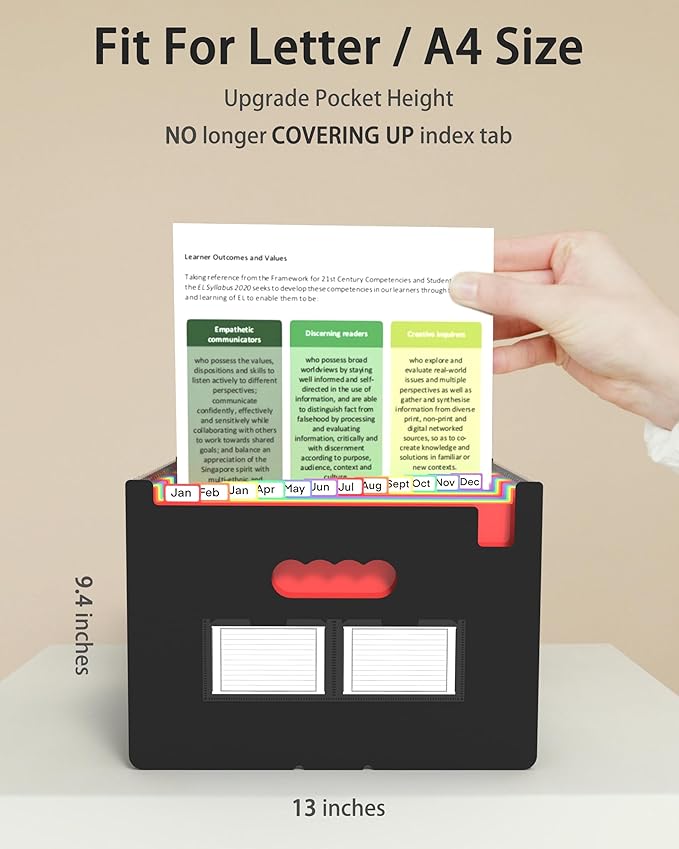 - 📂【EXPANDABLE & HIGH CAPACITY】-The file organizer keeps each slot's papers separated and organized in a good manner. 24 pockets expandable file folder. Product Size: Length: 13” High: 9.4'', width:1.96"-27". Expandable property gives it a possibility to hold approximately 3000 A4 sheets.