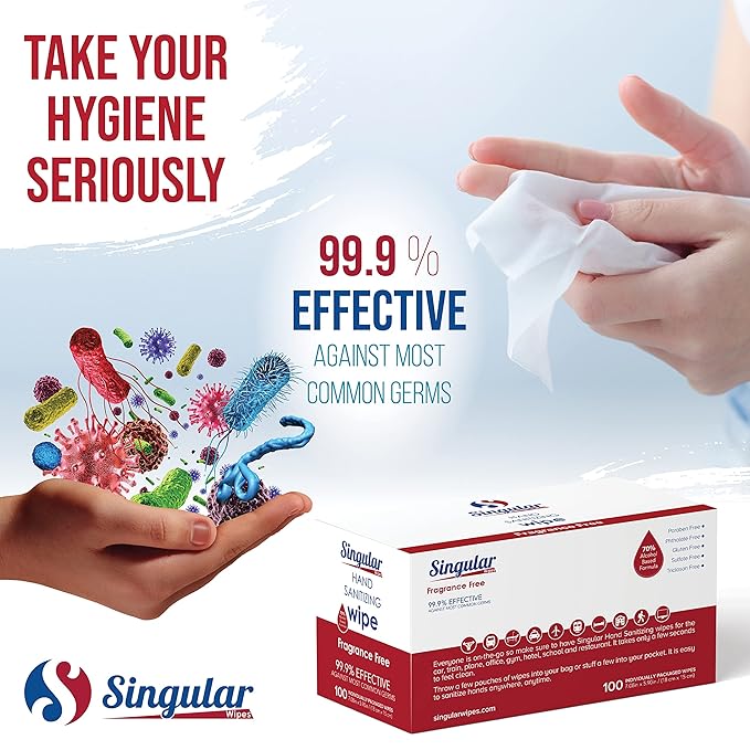 Hand Sanitizing Wipes Travel Size by Singular Wipes –100ct Individually Wrapped | Fragrance-Free, Moisturizing, 70% Isopropyl Alcohol Wipes | Travel, Home, Office, Daily Use | Made in USA