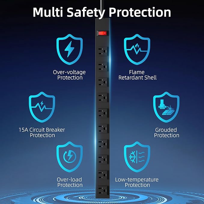 - OVERLOAD PROTECTION:A power switch with lighting has a built-in high quality 15A circuit breaker for overload protection. When the operating current exceeds the rated current, this power strip automatically cuts off the power supply from spikes, fires or other unsafe conditions.
