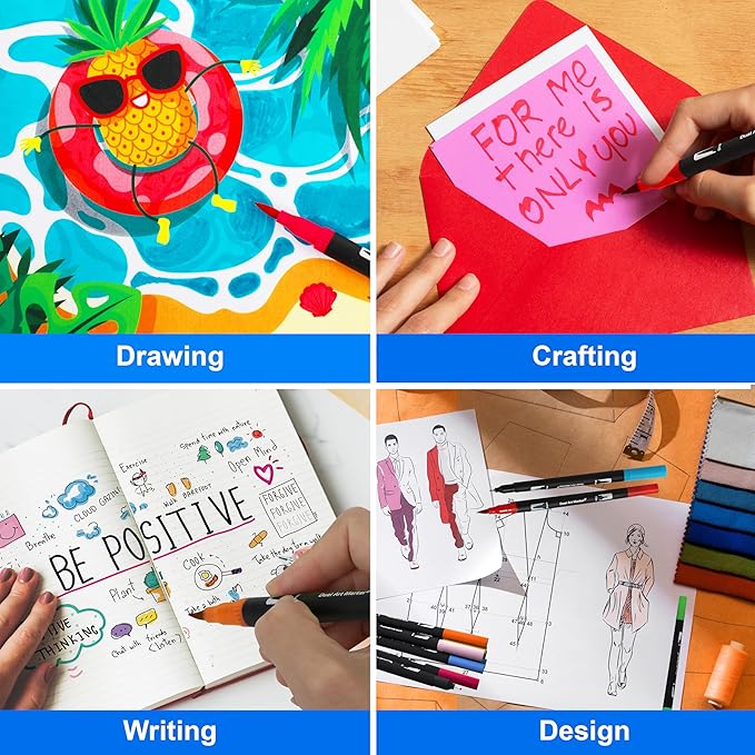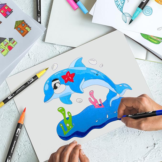 - 🎨Dual Brush Marker Pens: The coloring markers have a dual tip design with a 1-2mm brush tip and a 0.4mm fine tip, allowing you to create medium or bold strokes by varying the pressure of the brush, while experiencing fine strokes with the fine tip.The 0.4mm fine tip markers are great for sketching, tracing, and detailing, while the 1-2mm brush tip markers are great for giving large areas of color. The dual-head design fully meets your needs in different situations.