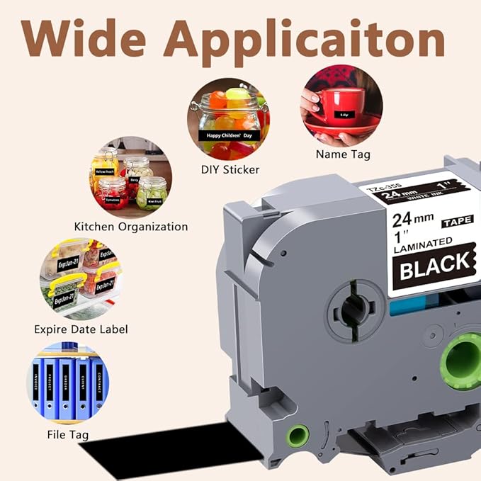 - Wide application: Compatible for Brother P-touch TZe 355 label tape is ideal to print clear, good-looking and durable labels. These labels are great for shelving, kitchen use, cabinets, file folders, USB sticks, food containers, storage boxes, personal possessions, children's school equipment with it's superior adhesive