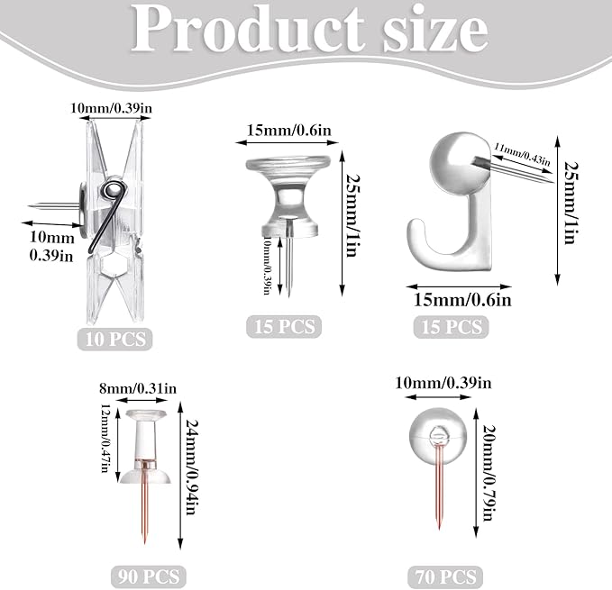 - 【Variety of Styles】You will receive 200Pcs push pins of 5 types in a plastic box, includes 10 clear clips pins, 15 big size clear I-shaped map marking pins, 90 small size I-shaped map marking pins, 15 push pin hooks, 70 roundness thumb tacks, roundness thumb tacks and small map marking pins have unique and delicate rose gold pins. Ample quantity and rich styles are enough to meet your daily needs.