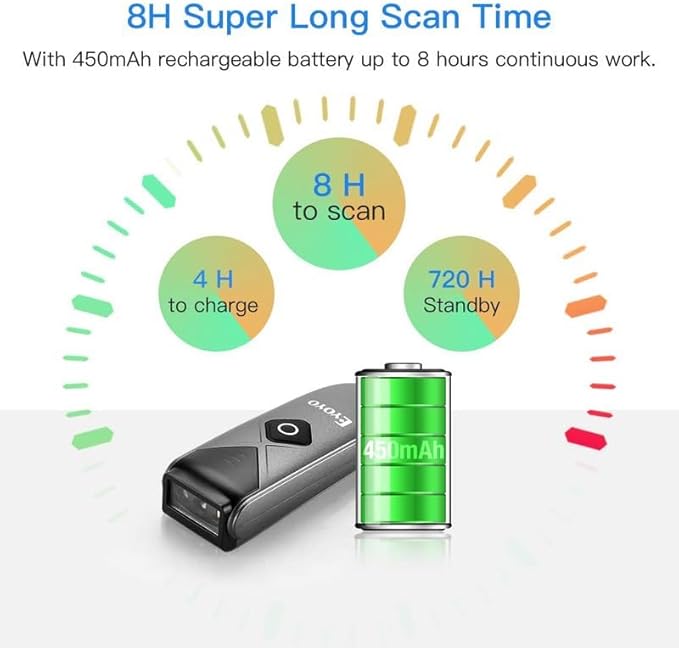 - Long-Lasting Rechargeable Battery & Energy Saving Design: Our upgraded wireless Bluetooth barcode scanner is equipped with a 450mAh high-capacity rechargeable battery, it can work continuously for 8 hours after 4 hours of full charge, 180-days super long standby time. To save power, the scanner will automatically shut down after 5 minutes of no operation by default. Users can set or cancel the shutdown time