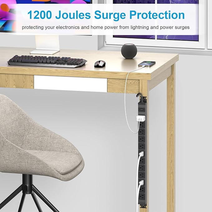 - Industrial Surge Protector: This power strip comes equipped with 1200J surge protector that safeguards your devices from sudden power spikes and fluctuations. The 10ft power cord provides sufficient reach to connect the power strip to a nearby outlet without any limitations. Surge protection and multiple outlets allow all devices to be plugged in with confidence.
