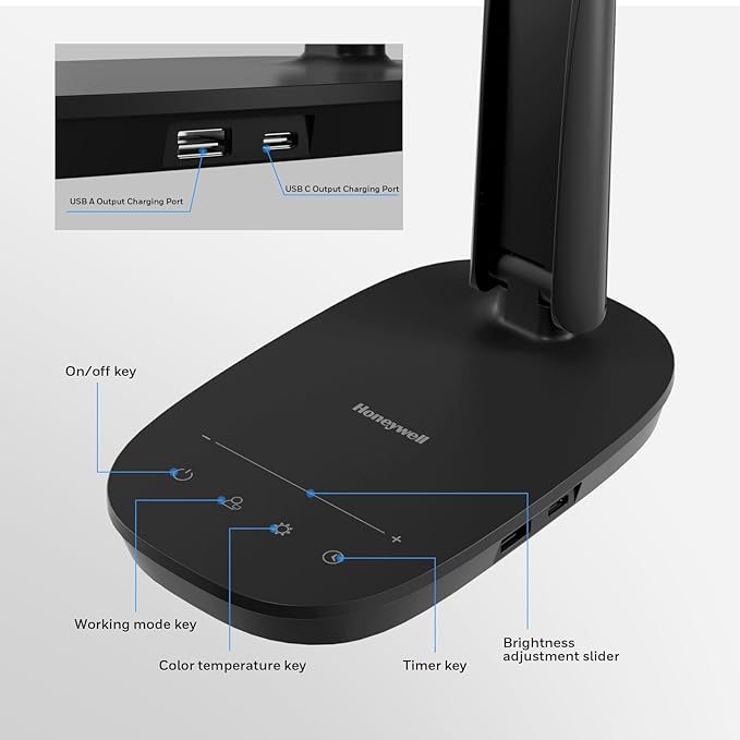 - 【Intelligent Touch for All Convenient 】 The smart touch reading light features a touch-sensitive panel design.Switch brightness levels and lighting modes at the touch of a button with a simple swipe of your finger.Honeywell H2 office desk lamp is equipped with a professional work lighting mode, providing convenient lighting for your work and office life. The 30-minute auto timer and memory function make your lighting choices smarter and more convenient.