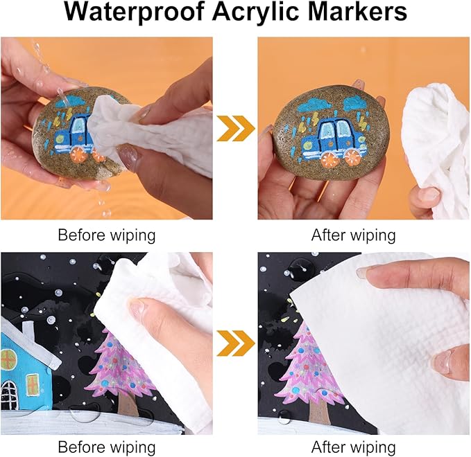 - Upgraded Waterproof and Easy to Use: Our new acrylic paint set do not require shaking or pressing the pen tip to release inkβjust open the lid and start using them directly! Coloring Markers set are made with water-based ink, which providing a smooth, consistent application with even ink flow for a more effortless painting experience. The resulting artworks are brightly colored, waterproof, fade-resistant, and sun-resistant, making them ideal for long-term preservation.