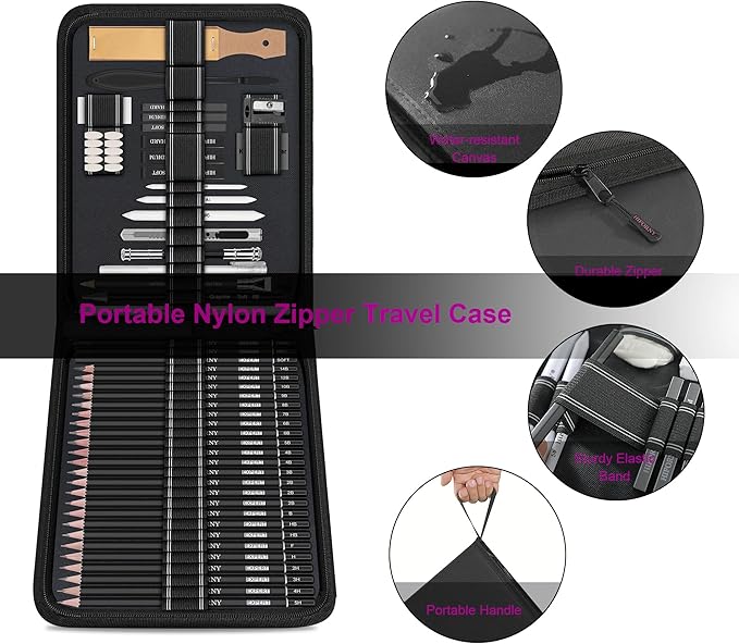 - Portable & Organized:Comes with a durable canvas pencil case that keeps all 58 pieces neatly organized and easily accessible. The compact design makes it perfect for artists on the go, ensuring you have your tools handy wherever inspiration strikes.