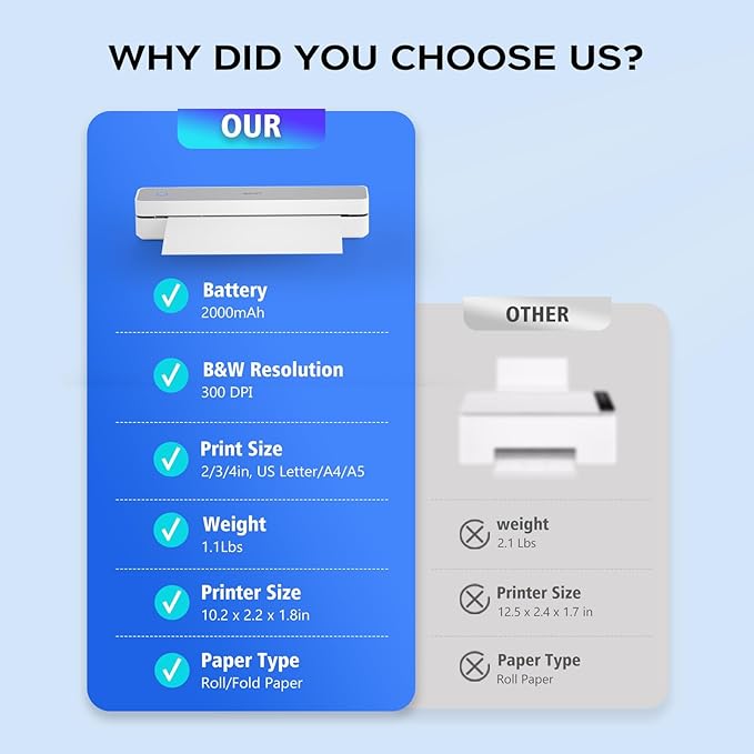 - HIGH-QUALITY PRINTING & LONG-LASTING BATTERY: Experience crystal-clear printing with the MT610 Pro 300DPI portable travel printer. Equipped with 1 built-in 2000mAh batteries, it offers up to 4 hours of continuous printing and 360 sheets on a single charge
