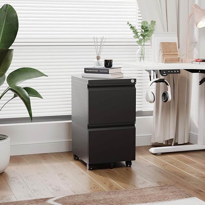 2 Drawer Metal File Cabinet with Lock, Rolling File Cabinets with Lock for A4/Legal/Letter Size, Under Desk Filing Cabinet for Home Office Assembly Required(Black)