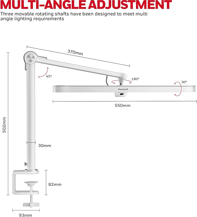 - Comfortable Natural Light: Honeywell HWT-05B02 desk lamp with clamp features a Sunturalux chip and 108 full-spectrum LED beads, offering a color rendering index (CRI(Ra)) β₯97. This design enables the LED desk lamp to mimic natural light, ensuring both comfortable illumination and accurate color reproduction.Enjoy the sunlight at home.
