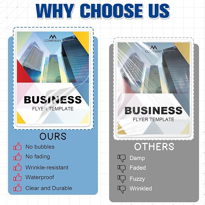 - Durable Material:These photo laminating sheets are made from premium materials,Crafted to withstand high temperatures and resist liquid penetration, stain-resistant, and water-resistant, more effectively protect your business cards.The laminating pouch with sealing temperature is recommended to be 257Β°F-266Β°F.these thermal laminate pouch guarantee that your items remain safe and intact, making them an excellent choice for both professional and personal use.