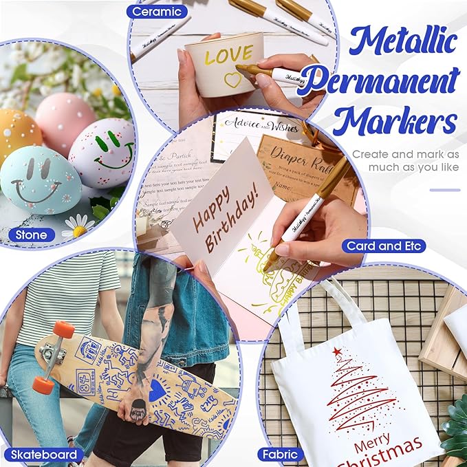 - Widely Application: These metallic permanent markers can add a metallic touch to your projects, perfect for making thank you cards, birthday cards, craft decorations, DIY photo albums or scrapbooks, signing, drawing, making personalized coffee mugs, DIY gift bags, labeling storage and shipping boxes, etc