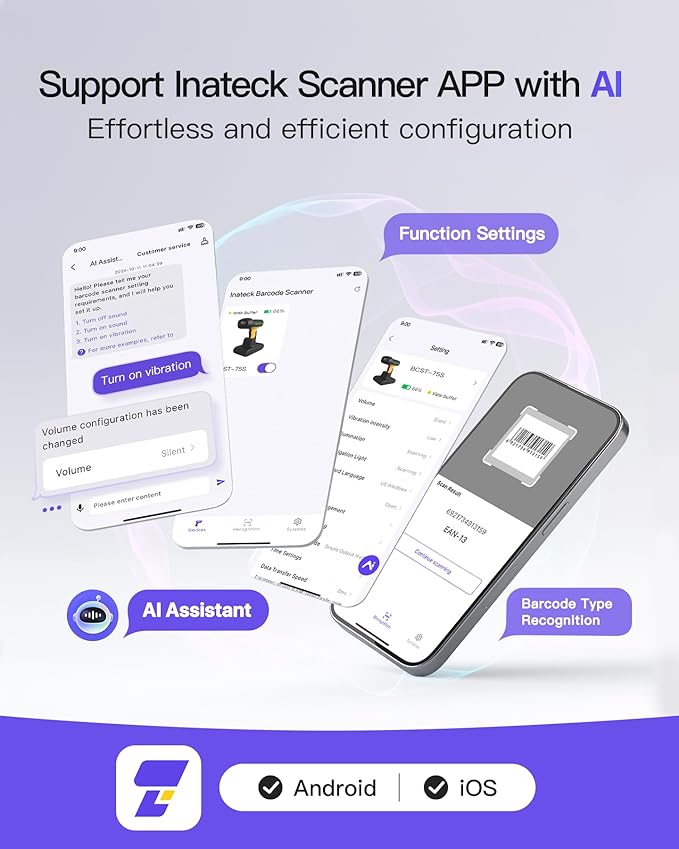 - Advanced Smart Technology: With Inateck low-power battery algorithm for exceptional endurance, a full charge allows 180 days standby and up to 180,000 scans. The Inateck APP is equipped with AI functions, allowing effortless setup and rapid data processing within seconds. Enjoy more customization options, faster operations, and greater simplicity. The SDK supports seamless integration with your system, greatly enhancing convenience