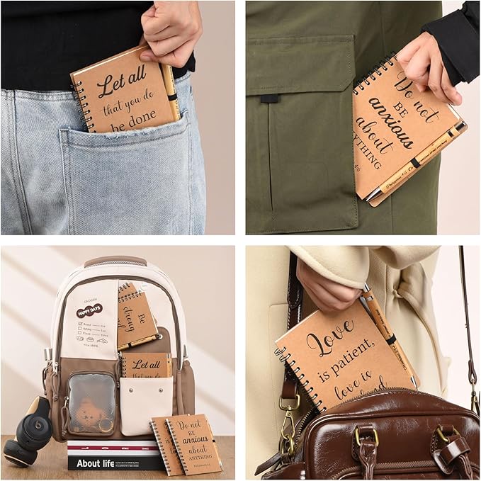 - Scripture Notebook & Pen Set – Includes 5 spiral-bound notebooks and 5 bamboo pens, each featuring a unique Bible verse. Ideal for personal reflection, journaling, or sharing with others.