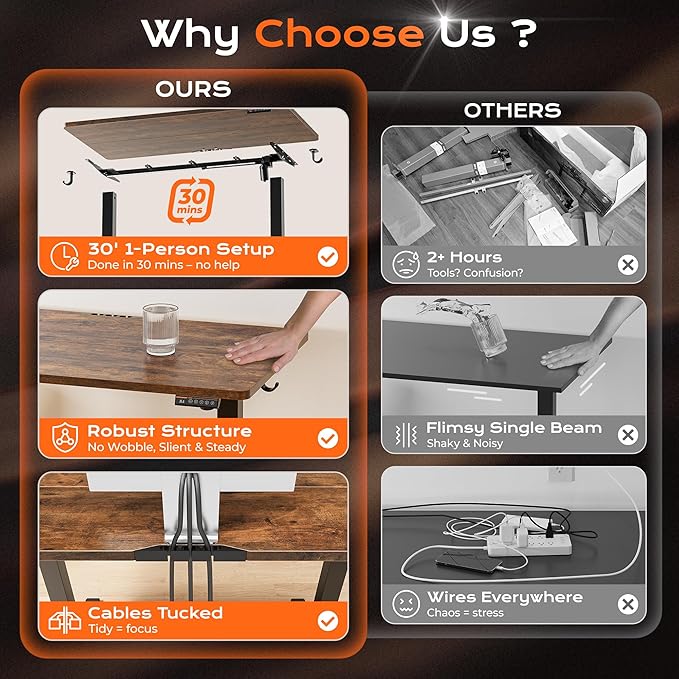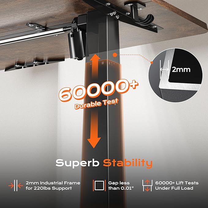 - 【Built to Last with Exceptional Stability】The industrial-grade steel frame and T-shaped design of the stand up desk support up to 220 lbs, ensuring stability and reliability for years to come. Paired with a durable motor, this home office desk is designed to meet the demands of your dynamic workday