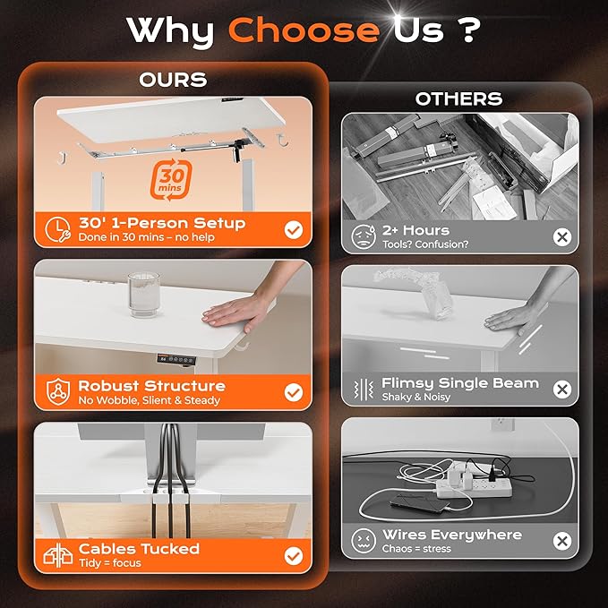 - 【Whisper-Quiet Operation】Powered by a robust yet quiet motor (operating at less than 45 DB), the wide deep desk brings smooth height adjustments without disturbing your household or office environment. This standup desk for home office is ideal for keeping focus and slient