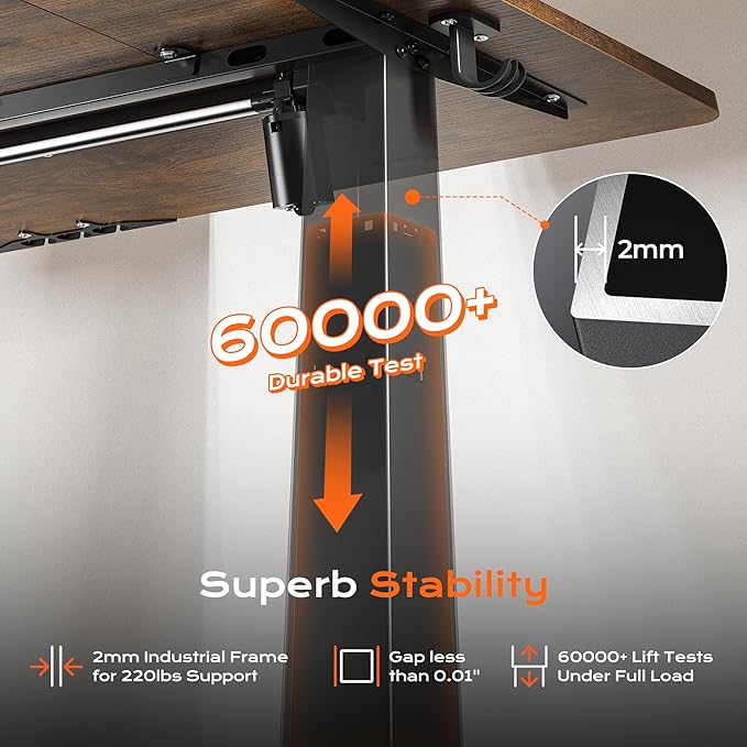 - 【Built to Last with Exceptional Stability】The industrial-grade steel frame and T-shaped design of the stand up desk support up to 220 lbs, ensuring stability and reliability for years to come. Paired with a durable motor, this home office desk is designed to meet the demands of your dynamic workday