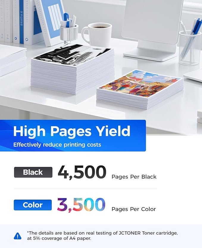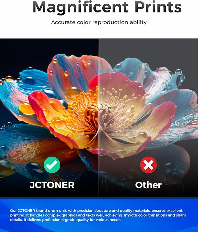 - The latest chip version: The JCTONER toner cartridges are equipped with the latest version of built-in chips, ensuring perfect compatibility between each toner cartridge and the printer. This enables you to print efficiently while maintaining stability and reliability, making installation convenient without the need for manual adjustments. All JCTONER toner cartridges have undergone strict quality testing and have obtained ISO9001 certification. High-quality toner cartridges can meet the demand for high printing volume. The fine toner ensures clear and stain-free printing results and extends the lifespan of the printer. You can purchase with confidence.