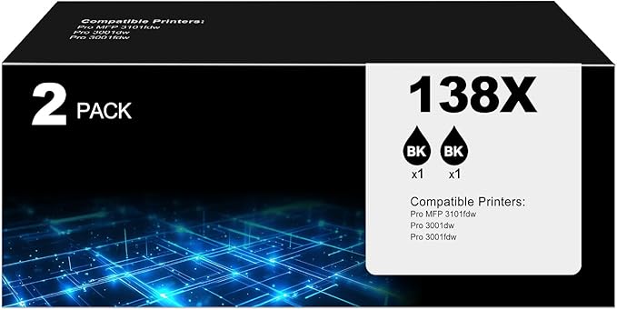 - Compatible for HP 138X Black Toner Cartridges 2 Pack Printer Model:for hp 138X black Toner Cartridges Compatible for hp color Laser pro mfp 3101fdw toner, color Laser pro 3001dw toner, Laser Pro MFP 3101sdw, color Laser pro 3001fdw toner