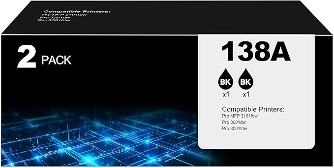 - Compatible for HP 138A Black Toner Cartridges 2 Pack Printer Model:for hp 138A black toner cartridges compatible for hp color pro mfp 3101fdw toner, color pro 3001dw toner, Pro MFP 3101sdw, color pro 3001fdw toner.